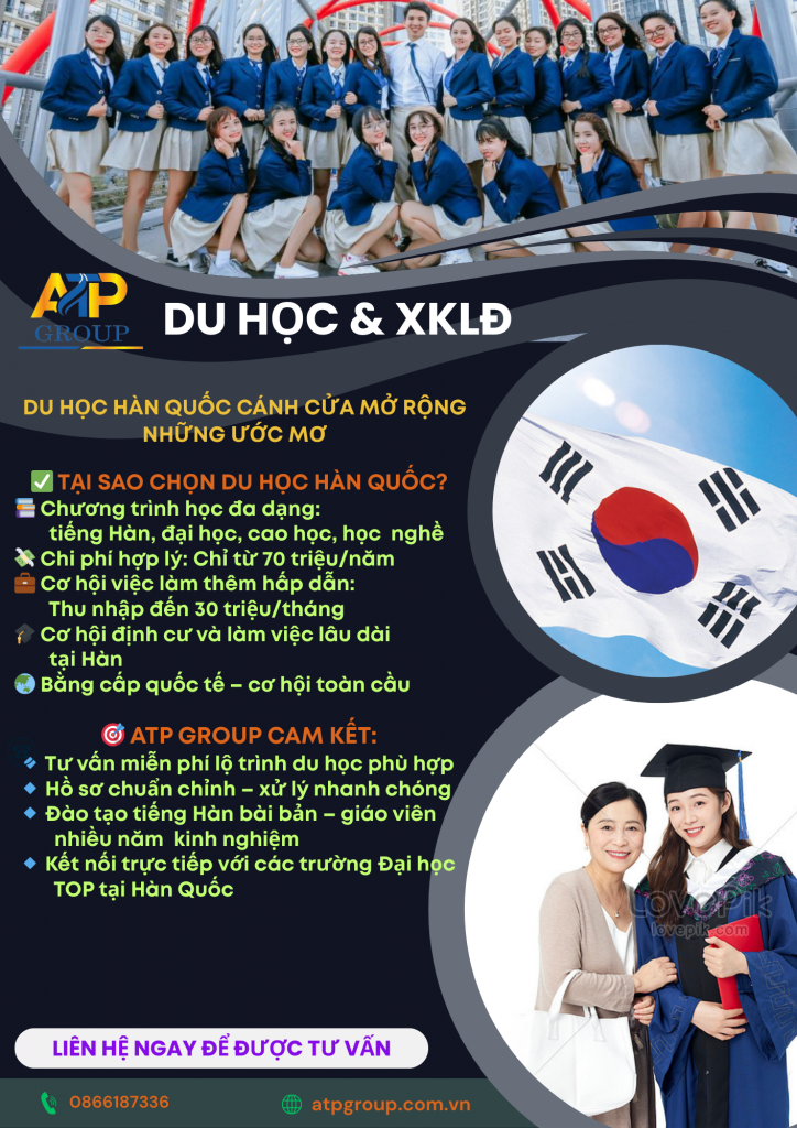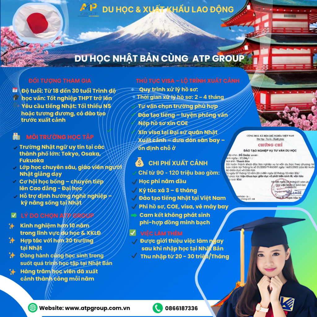 ATP Group là đơn vị hàng đầu chuyên về lĩnh vực du học và xklđ các nước, với hệ thống chi nhánh và văn phòng đại diện trải dài khắp cả nước ATP Group đã giúp đỡ được hàng nghìn học sinh sinh viên và người lao Việt Nam sang sinh sống, học tập và làm việc tại nước ngoài như: Đài Loan, Nhật Bản, Hàn Quốc, Australia, CHLB Đức, Hy Lạp…